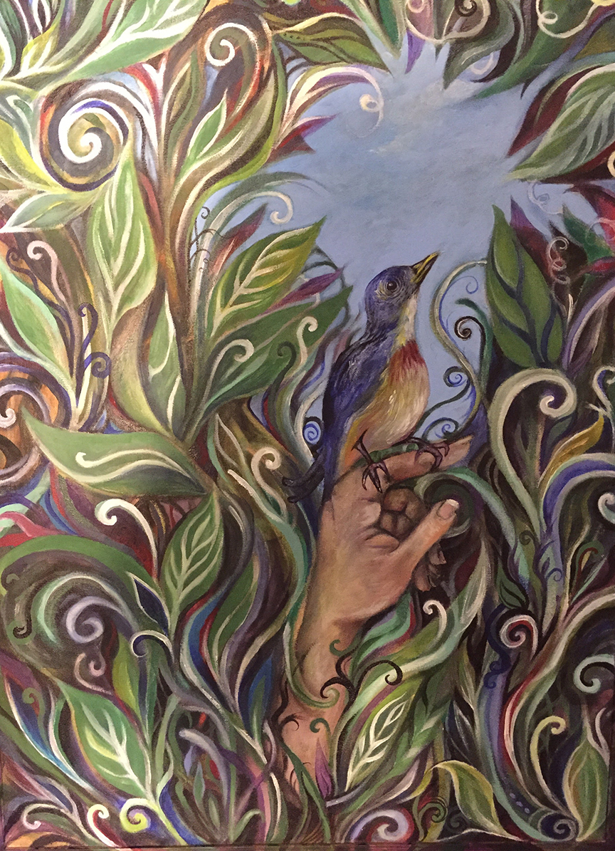 The symbolism is not obscured. One does not need to be an expert in art interpretation or psychology to see that the figure in the picture is lost deep in the tangle of vegetation, smothered but still making an effort to reach out towards the clearing. Though the little bird may have an opportunity to take flight, at first glance it seems unlikely the hidden figure will. I think the case could be made that a sacrifice has been made to give the little bird a chance. The fact that I know that underneath this painting is the last self portrait I attempted before moving to Mexico literally adds another layer of meaning. Even though the years of marriage and children have covered up who I once was, I like the new painting better than the old one. I do not wish to move backwards. If by chance someone should climb up out of the tangle I would not want it to be the same person who got covered up to start with.